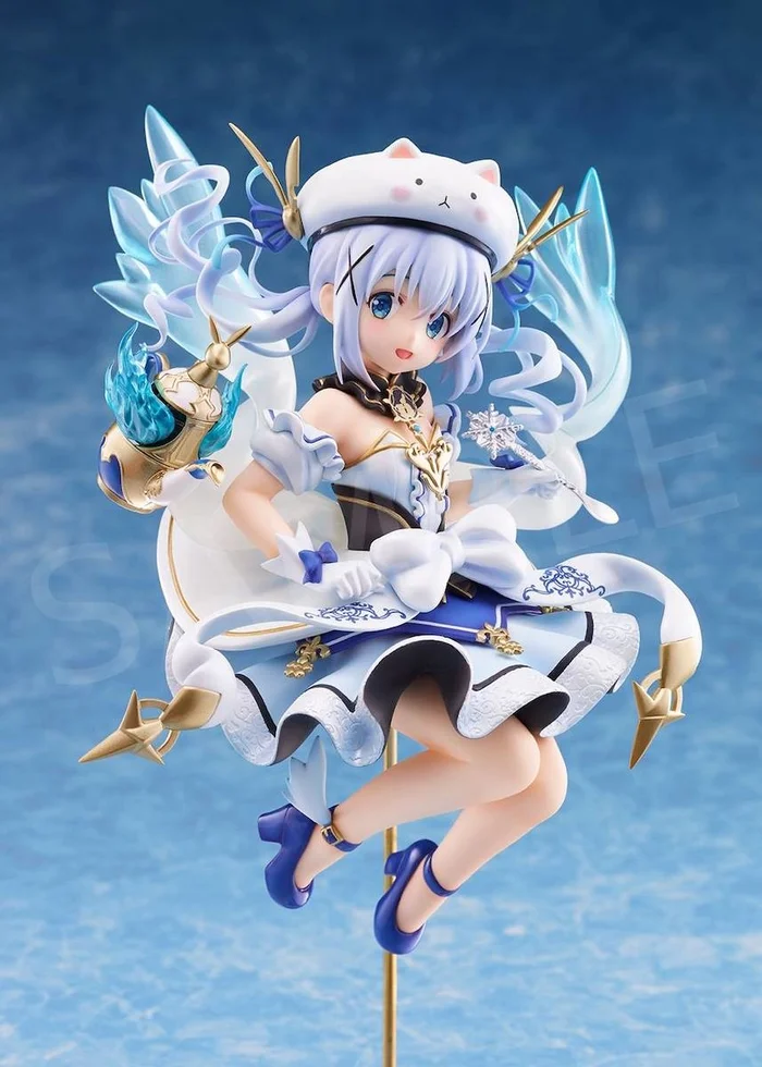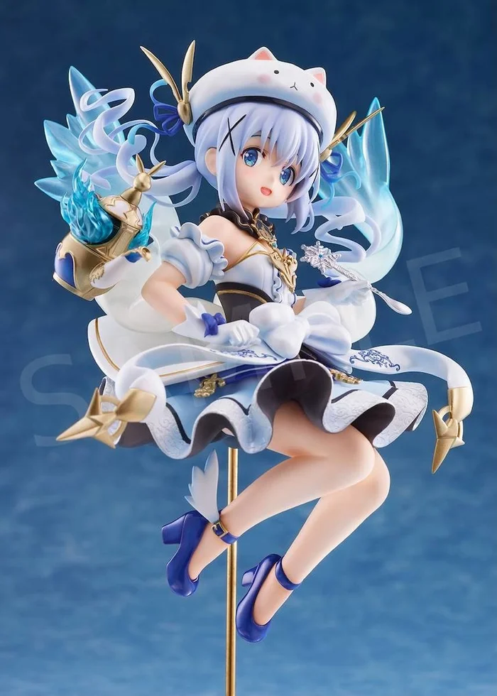 Bless! It’s Chino, from the hit anime Is the Order a Rabbit? and mobile game Kirara Fantasia! Bringing to life Chino’s illustration for the game, the figure is 8.7″ tall, captured in a joyful jumping pose. As a water magic user, Chino’s elegant dress has a blue and white motif with ephemeral water wings coming out from her lower back. The patterns on her skirt have been painstakingly sculpted to perfection. She’s also decorated with mini wings on her shiny blue shoes, as well as an enchanted golden teapot! Our precious magical girl isn’t adventuring alone, either – joining in on the fun is her faithful companion, Tippy, in hat form!