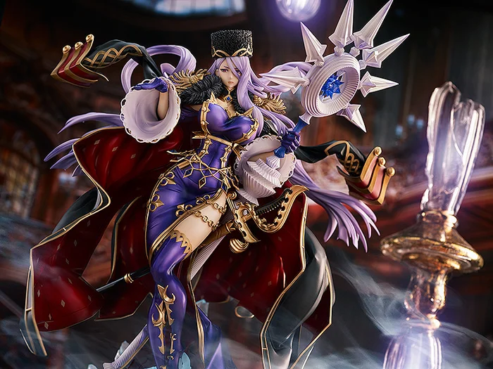 Her complex outfit has been completed with great attention to detail such as the textured sculpting of her Papakha (fur hat), diamond paintwork pattern inside her Imperial coat, and intricate golden ornaments of her skin-tight purple dress underneath. Her staff and sword have also been faithfully recreated in awe-inspiring quality with intricate sculpting and translucent parts. She flashes a silent, cold glare that demands attention, so give her all of yours by placing her in the center of your collection!